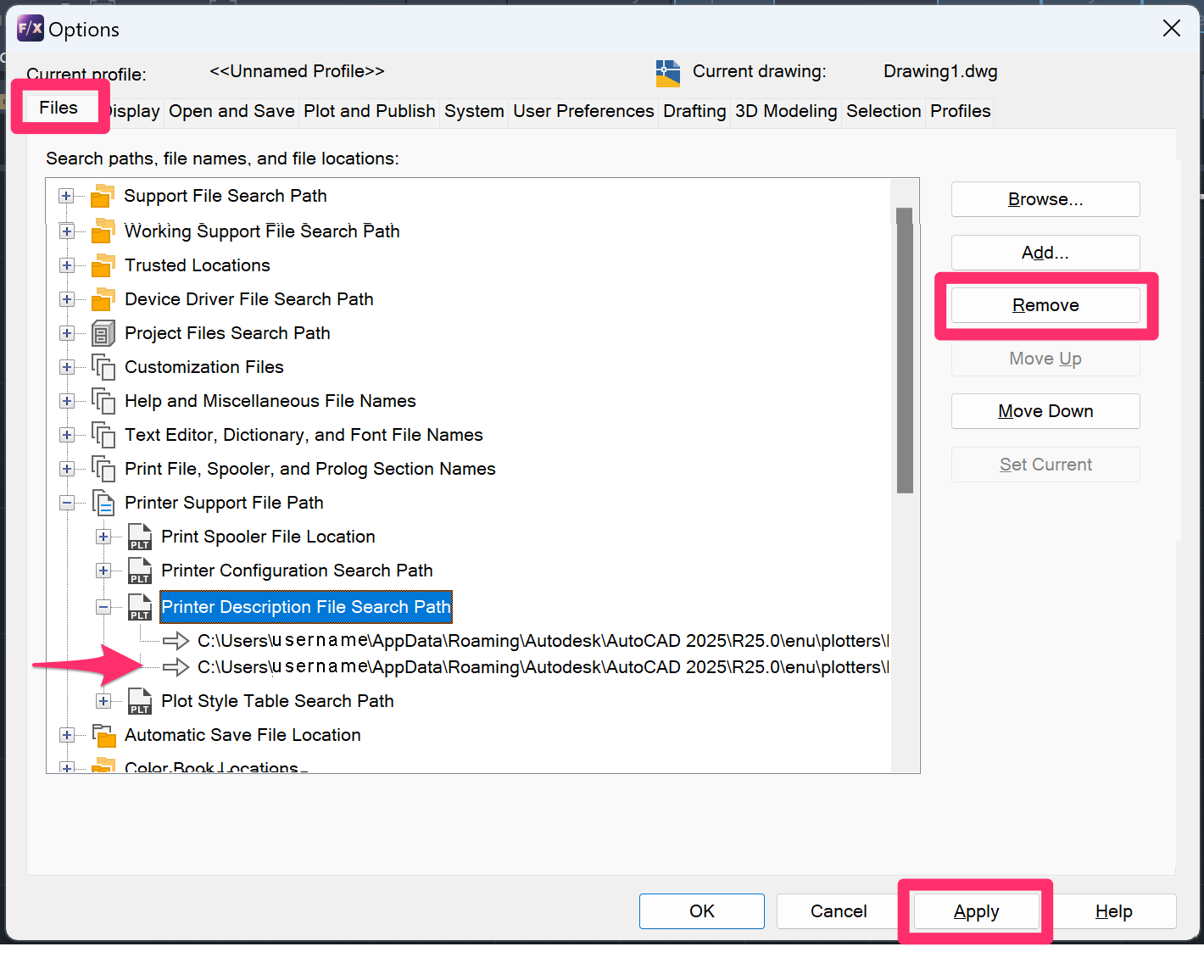 If you find an incorrect path, click it to select it, then click the Remove button to remove the path. Click Apply when finished removing paths, then select the option to save the changes.
