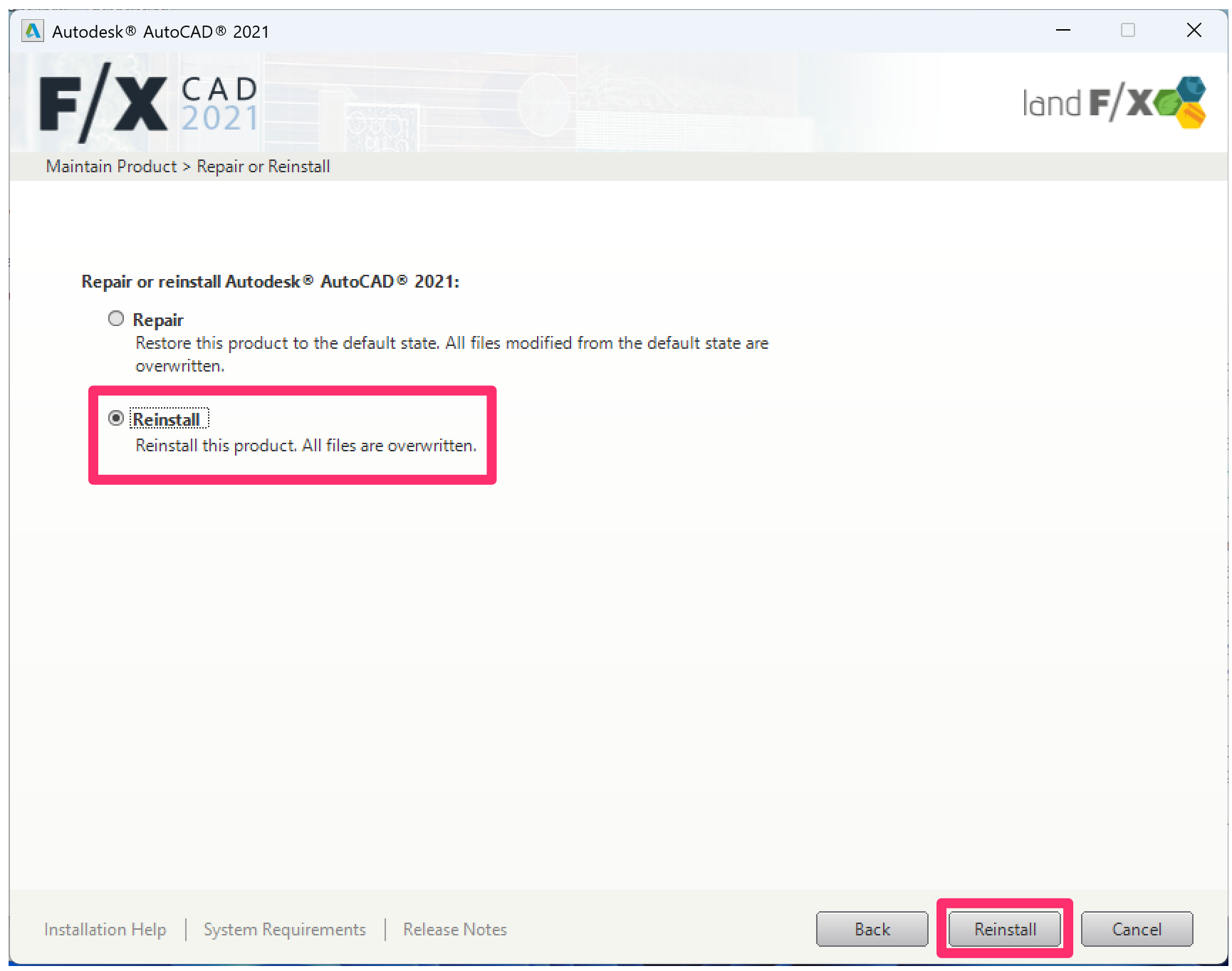Beginning with F/X CAD 2023, F/X CAD installations no longer include the Reinstall option. If you have F/X CAD 2023 or newer, you'll need to follow our steps to uninstall and reinstall F/X CAD instead.